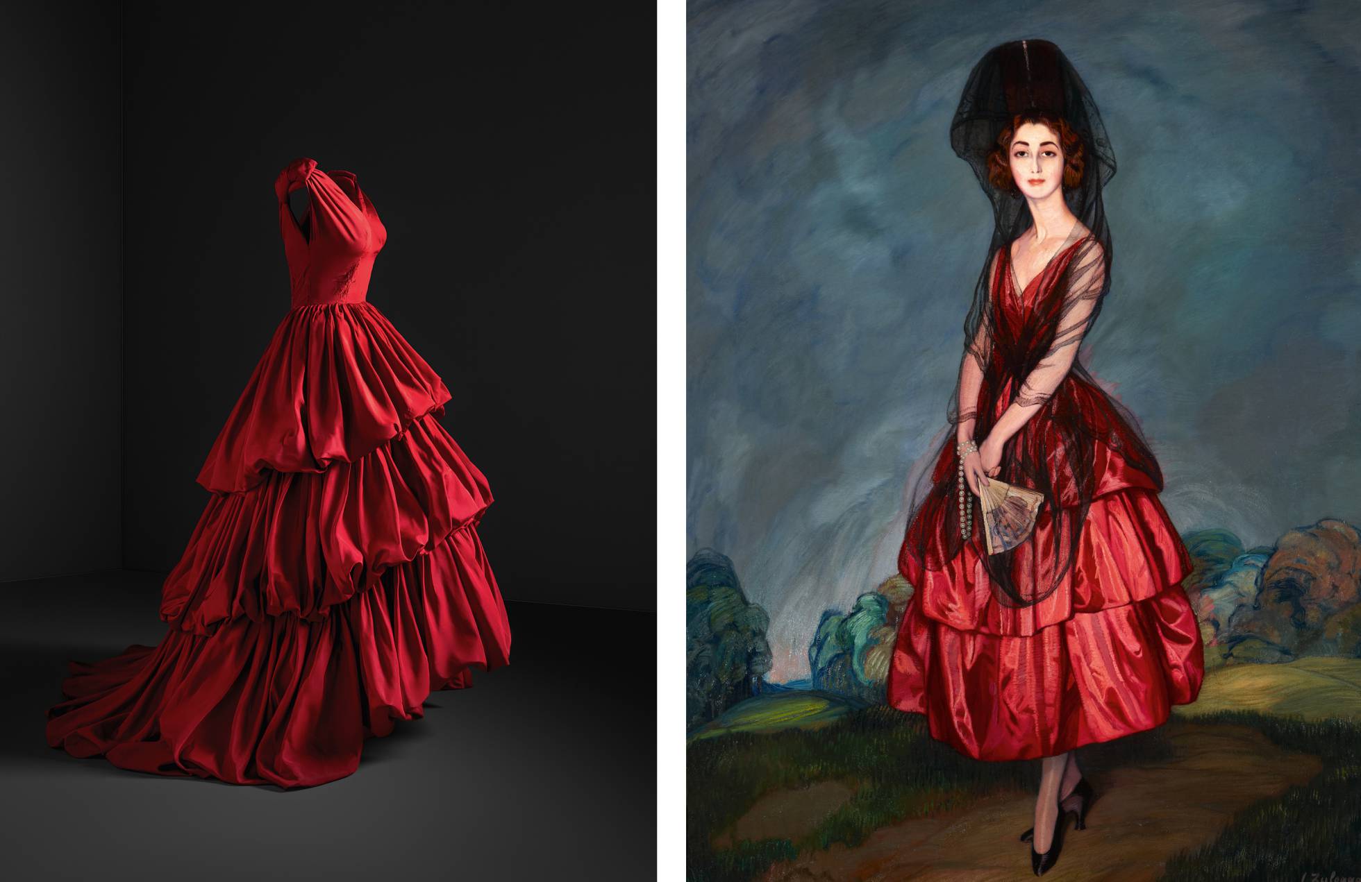 По словам Мартинес де ла Пера, прибыв в Париж в 1936 году, модельер еще с большим усердием отражает испанские традиции в своих нарядах. Во французской столице собрана огромная коллекция, где можно увидеть костюмы пехотинцев, как будто сошедшие с картин Веласкеса, кружева и галстуки с картин Гойа и кобальтовый синий цвет, использовавшийся Эль Греко. Портреты придворных дам вдохновляли его на протяжении всей его карьеры. На выставке можно познакомиться со знаменитым портретом астурийской герцогини, одетой в белый наряд с красными бантами, и рядом с ней костюм 1960 года, который имеет ту же цветовую и стилистическую комбинацию.