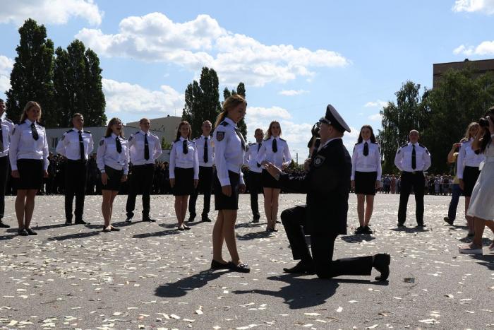Для Аліни Даньшиної, цьогорічної випускниці Харківського національного університету внутрішніх справ, урочистості з нагоди закінчення вишу завершилися не лише отриманням диплома, але й пропозицією руки та серця.