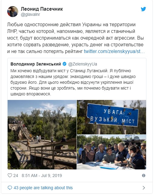 В другом твите Пасечник пишет, что, в случае необходимости, они ("ЛНР") могут сами полностью восстановить этот мост.