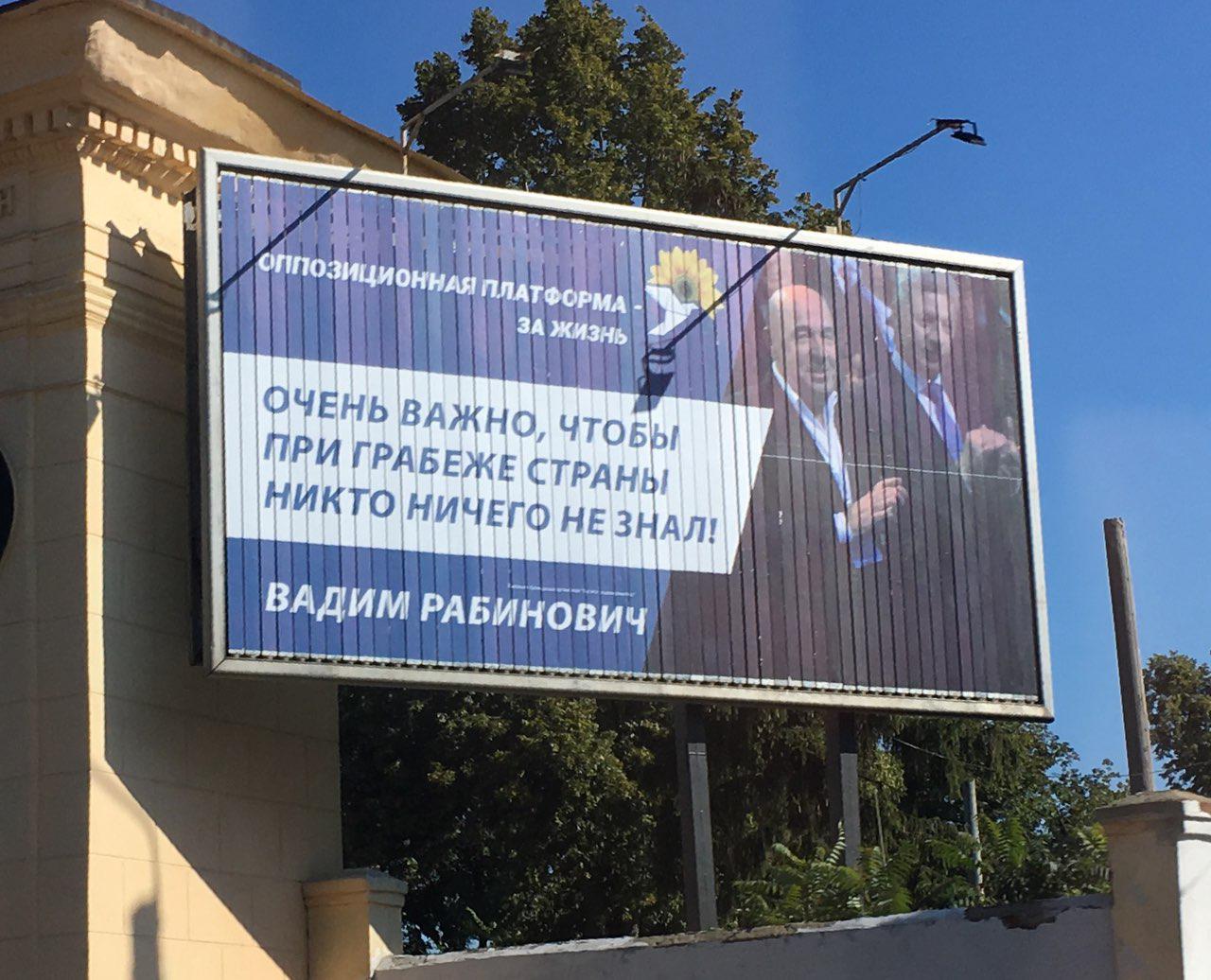 В Харькове на площади Защитников Украины размещен рекламный билборд партии "Оппозиционная платформа – за жизнь". Одним из своих предвыборных слоганов партия избрала фразу одного из своих лидеров Рабиновича: "Очень важно, чтобы при грабеже страны никто ничего не знал".