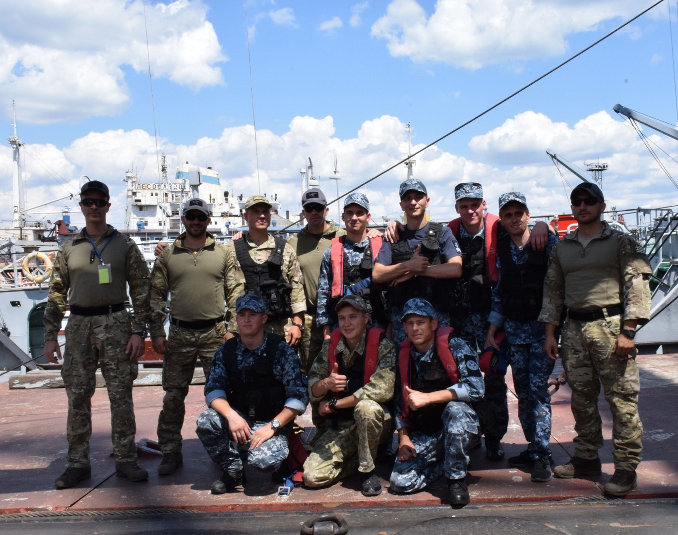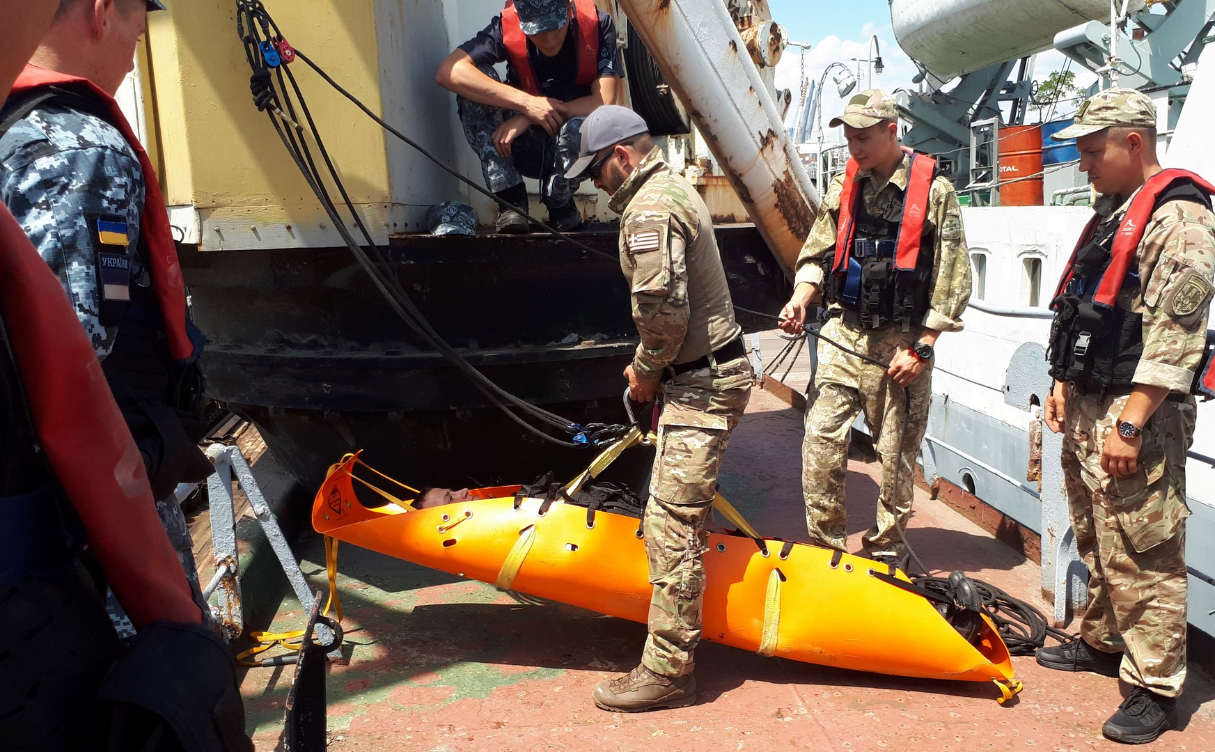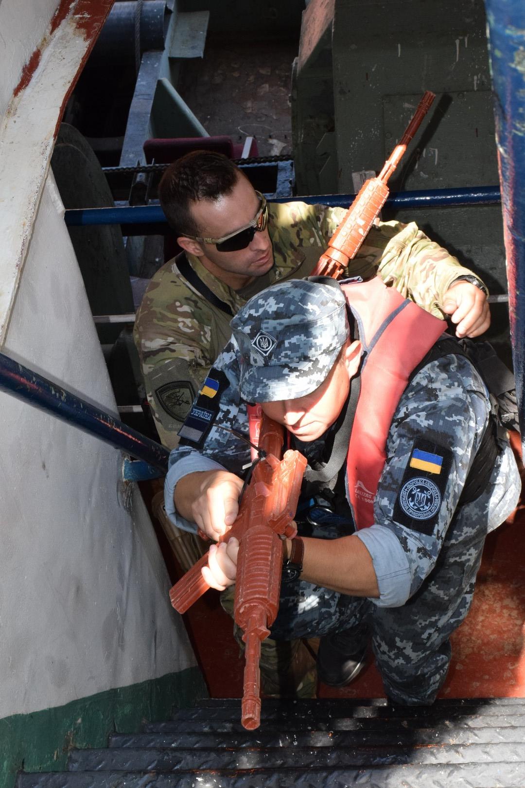 Оглядові команди із корабельно-катерного складу Морської охорони з Одеси та молоді бійці відділів спеціальних дій на воді в Маріуполі та Ізмаїлі паралельно із групами оглядачів США та Румунії вивчали теорію та відпрацьовували застосування отриманих знань на практиці в умовах реального судна: підйом на судно із проходженням до точок керування, блокування агресивних членів екіпажу, особливості проходження трапами і переходами поміж споруд на палубі та інші тонкощі роботи оглядової групи на судні.