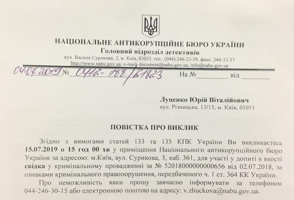 Генеральний прокурор Юрій Луценко викликається на допит до НАБУ з приводу прийняття ним процесуального рішення про передачу резонансного кримінального провадження відносно учасника Євромайдану Івана Бубенчика складу прокурорів на чолі із куруючим заступником Генпрокурора А.Стрижевською для здійснення неупередженого та ефективного досудового розслідування.
