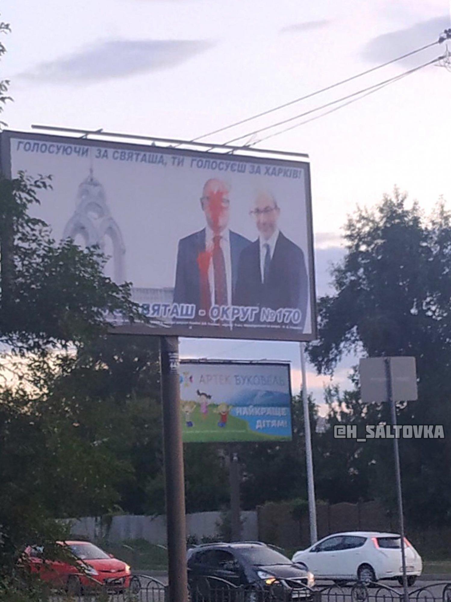 Фотофакт: В Харькове испортили билборд со Святашем 13 июля 2019 09:46 В Харькове на ул. Героев Труда неизвестные залили красной краской билборд кандидата в в народные депутаты по 170-му избирательному округу от ОПЗЖ Дмитрия Святоша.