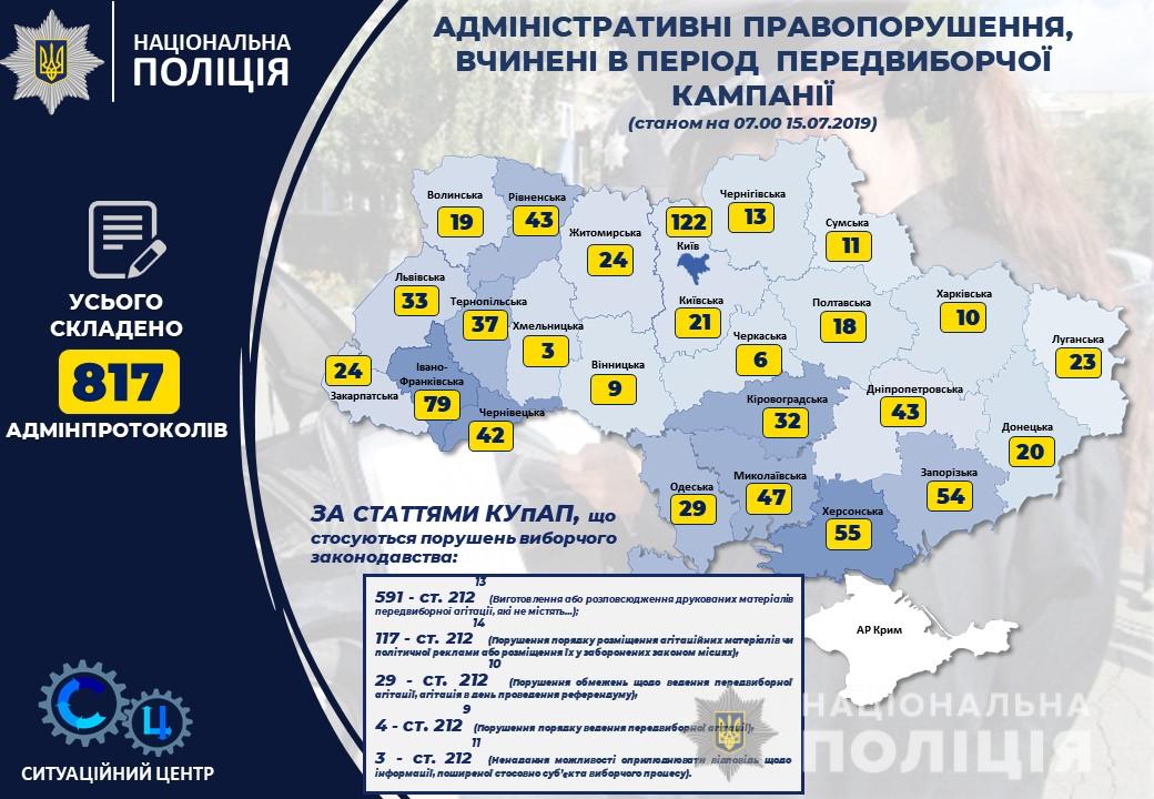 Всего с начала предвыборной кампании полиция внесла сведения в Единый реестр досудебных расследований по 210 фактам. В частности, 157 уголовных производств касаются нарушений избирательного законодательства, еще 53 уголовных производства - связанные с проведением избирательной кампании. Также составлено 817 административных протоколов.
