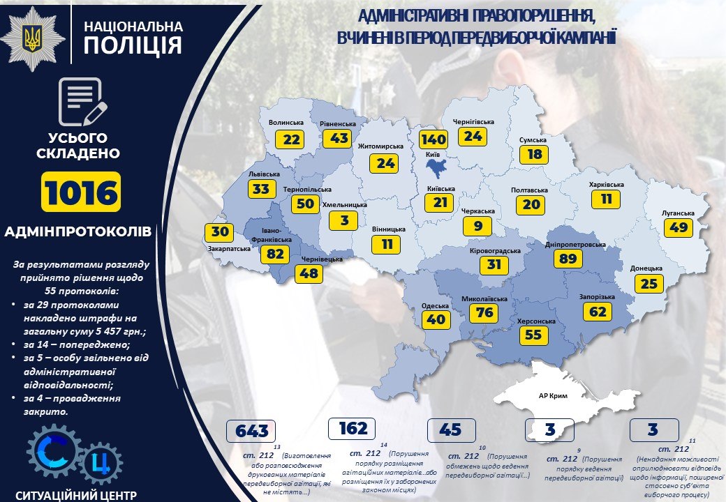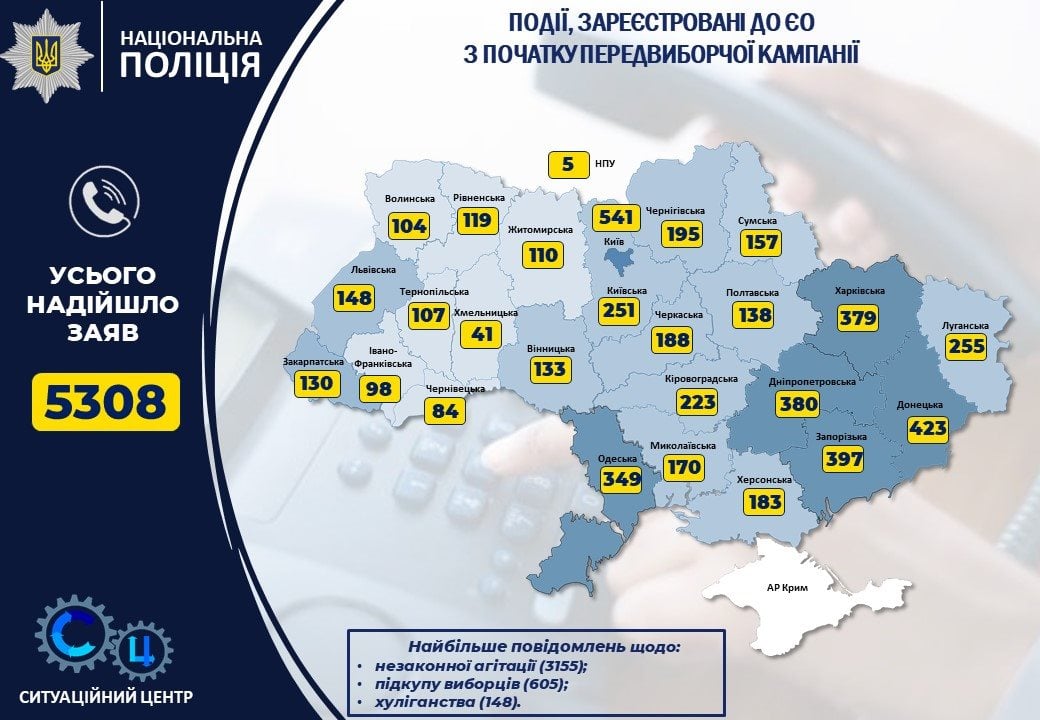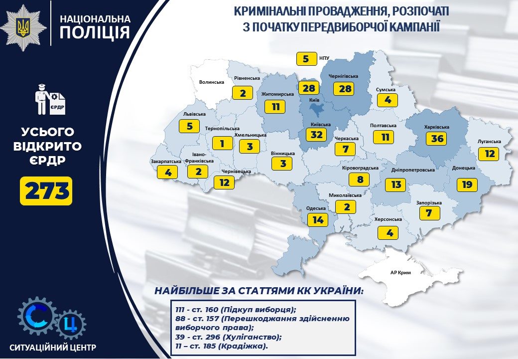 Він поточнив, що слідчі Нацполіції відкрили 273 кримінальні провадження, пов’язані з можливим порушенням виборчого законодавства. Майже 75% із зареєстрованих кримінальних проваджень безпосередньо стосуються порушення виборчих прав громадян та пов'язані із перешкоджанням вільному здійсненню громадянами свого виборчого права (ст. 157 КК України) – 88 проваджень та підкупом виборців (ст. 160 КК України) – 111 проваджень.
