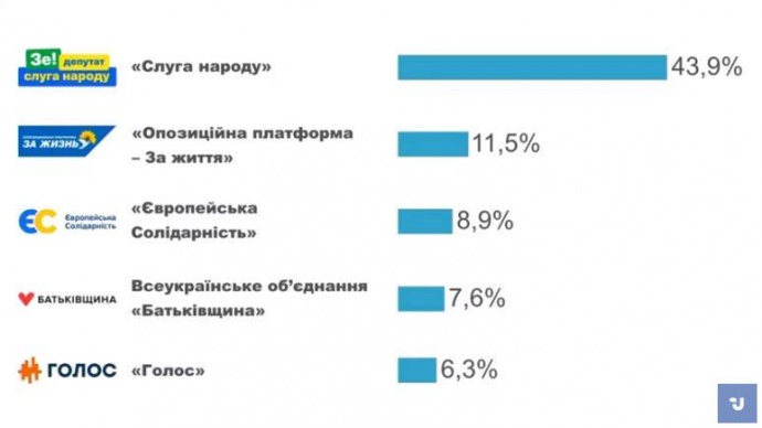 Лидером электоральных симпатий стала президенстька партия "Слуга народа" - 43,9%.
