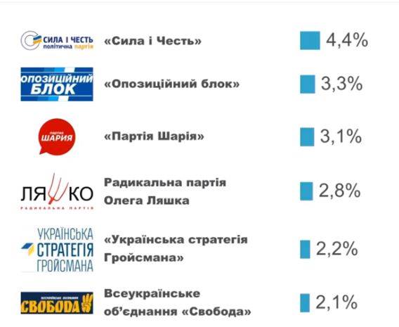 На внеочередных парламентских выборах 2019 года барьер в 5% преодолевают пять партий: "Слуга народа", "Оппозиционная платформа - За жизнь", "Европейская солидарность", ВО "Батькивщина" и "Голос".