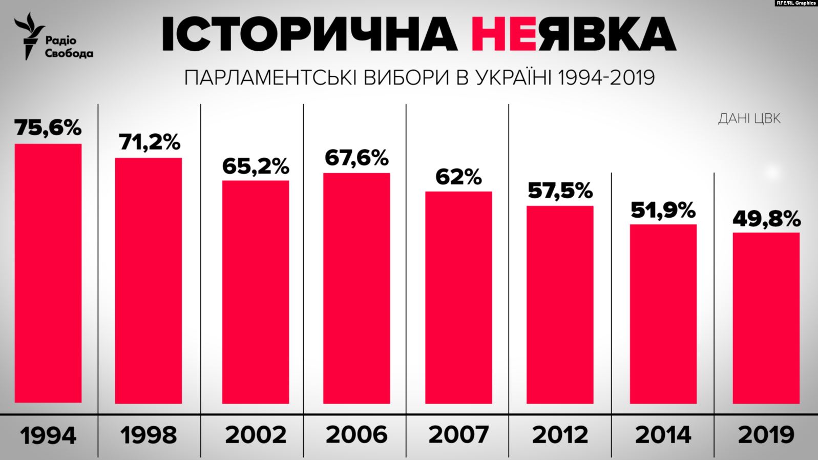 Наиболее активными украинцы были в первом туре парламентских выборов в 1994 году. Тогда явка составила 75,6%.
