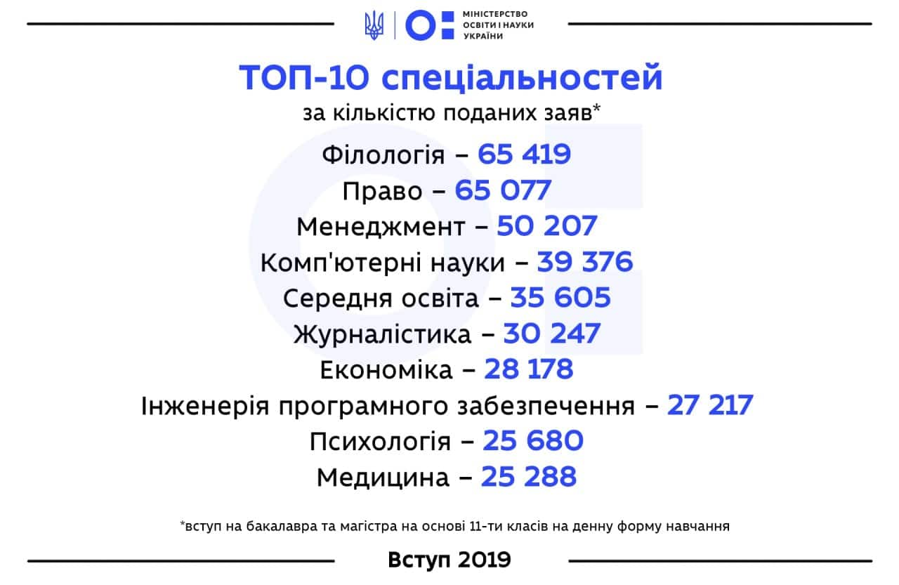 "Наибольшая категория поступающих - на бакалавра и магистра на основе 11-ти классов на дневную форму обучения - подали в вузы 831 тыс. 493 заявления в электронной и бумажной формах. Самыми популярными среди таких поступающих стали заведения Киева, Львова, Харькова и Днепра, а чаще всего они хотят стать филологами, юристами, менеджерами, IT-специалистами и педагогами", - говорится в сообщении пресс-службы Минобразования.