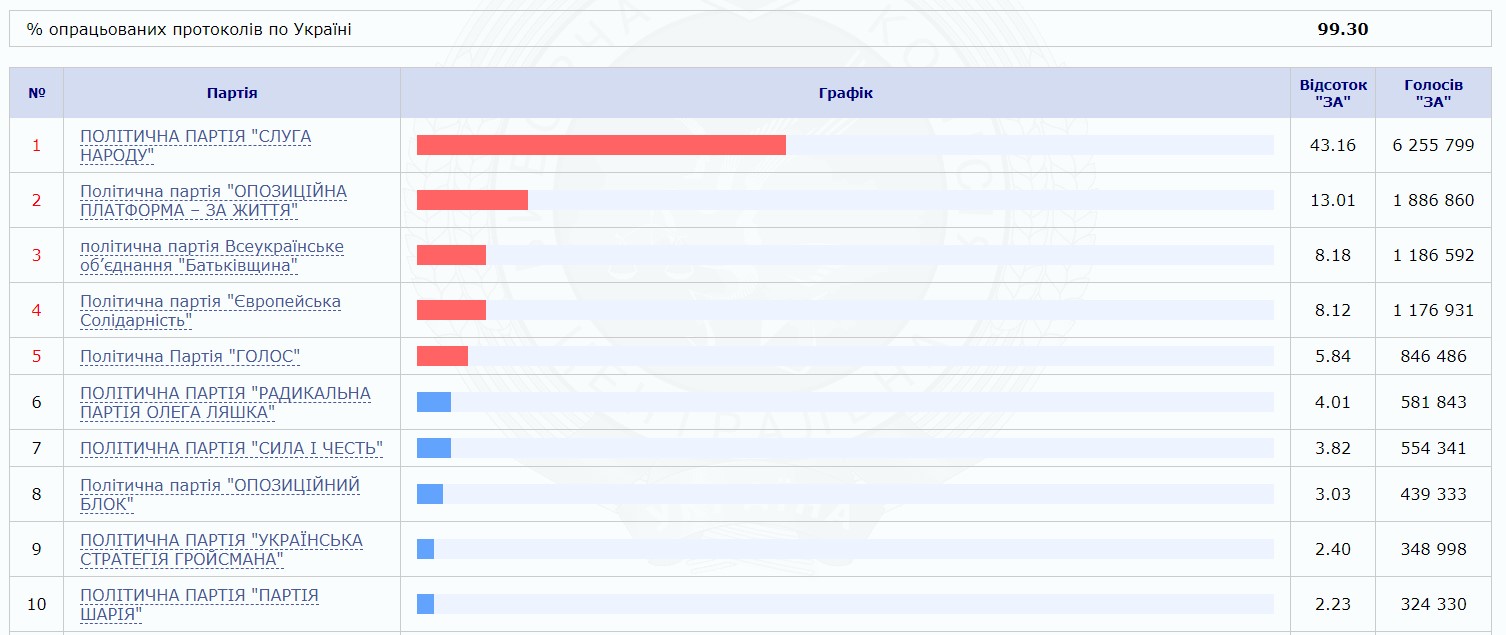 По результатам обработки 99,30% протоколов голосования, партия-лидер "Слуга народа" получила 43,16% голосов.