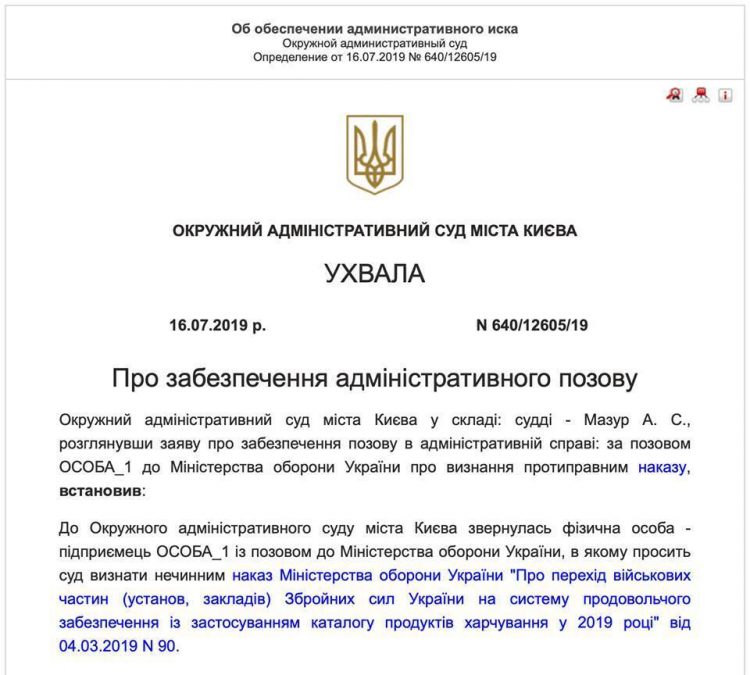 "Остановить действие приказа Министерства обороны Украины "О переходе воинских частей (учреждений, заведений) Вооруженных сил Украины на систему продовольственного обеспечения по применению каталога продуктов питания в 2019 году "№90 от 03.04.2019 до вступления решения в законную силу", - говорится в постановлении по иску.
