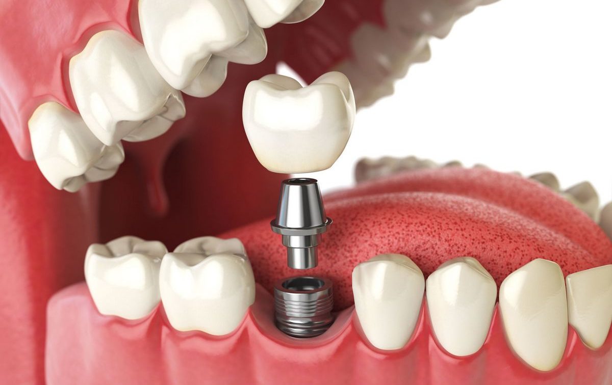 Имплантант — это полноценный аналог натурального зуба. Роль корней выполняет вживляемый в костную ткань титановый штифт. На него ставят абатмент — переходник, на котором будет держаться коронка. Затем устанавливают саму коронку. Она полностью имитирует натуральную (если речь идет о керамических изделиях).