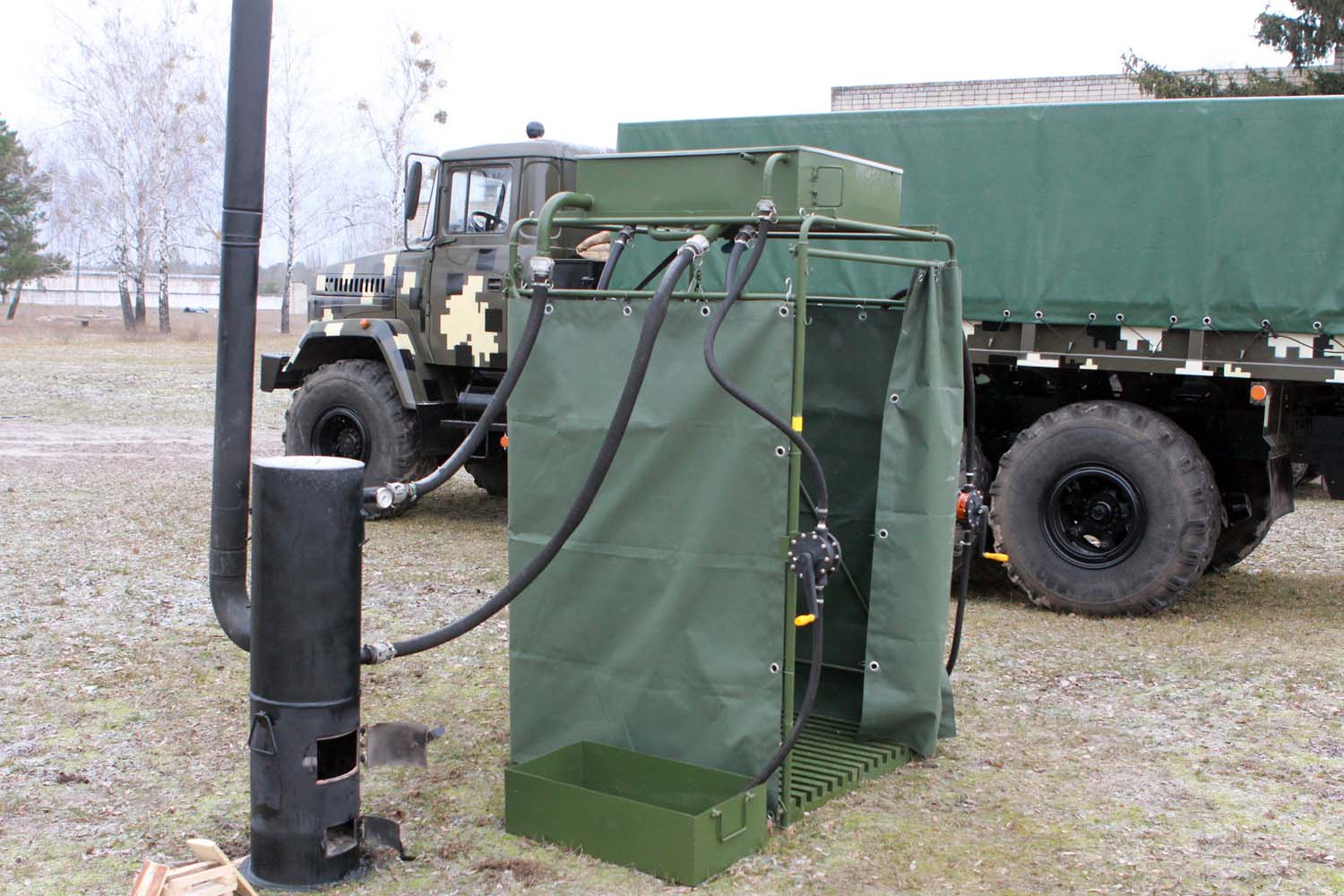 Для эксплуатации в полевых условиях украинскими производителями была разработана специальная душевая кабина-котел скоростного нагрева воды (КШВН).