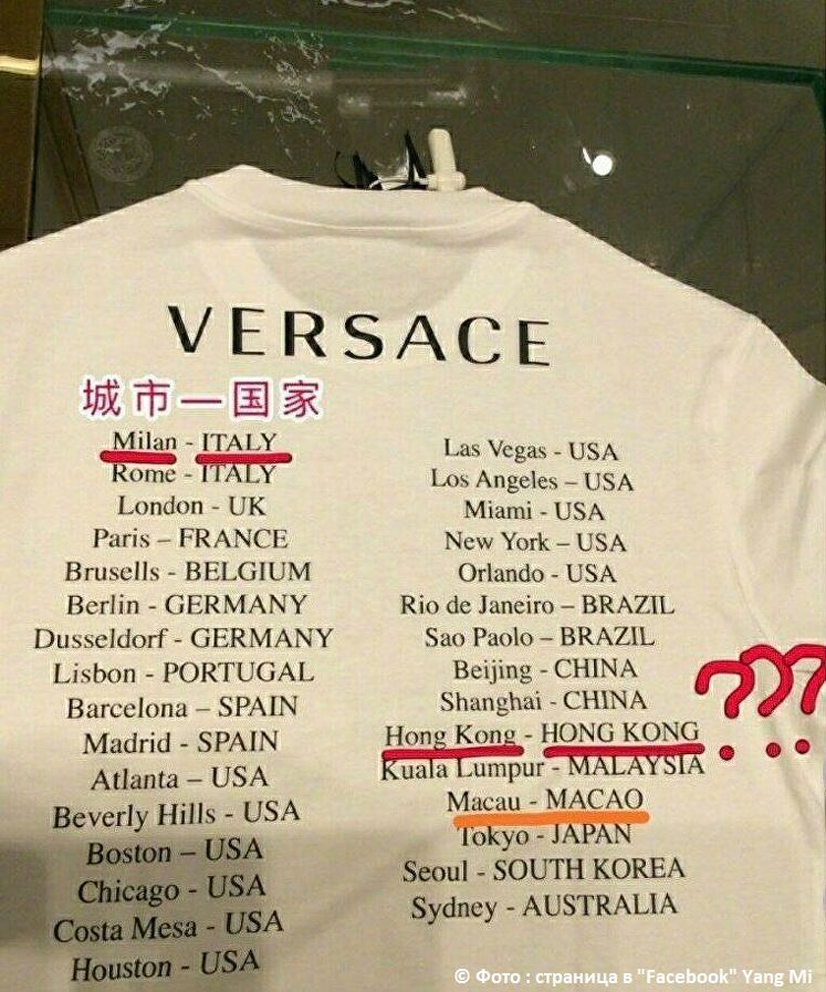 Сообщается, что на одежде Versace специальные административные районы Китая Гонконг и Макао отмечены как отдельные государства.
