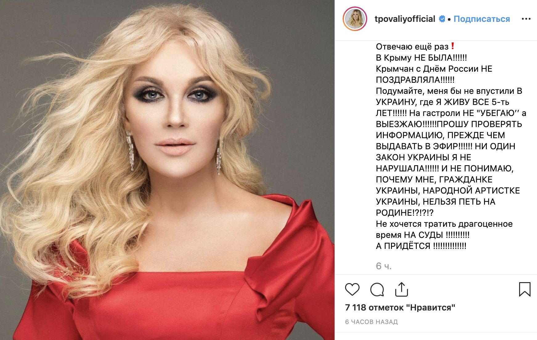 "Задолбала сплошная ложь вокруг моей персоны! Отвечаю еще раз! В Крыму не была! Крымчан с Днем России не поздравляла! Подумайте, меня бы не впустили в Украину, где я живу все пять лет! На гастроли не "убегаю", а выезжаю! Ни один закон я не нарушала! И не понимаю, почему мне, гражданке Украины, Народной артистке Украины, нельзя петь на родине? Не хочется тратить драгоценное время на суды, но придется," – написала Повалий.