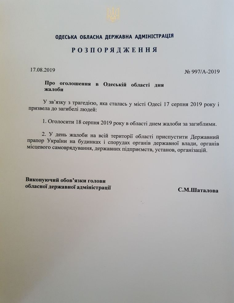 "В связи с трагедией, которая произошла в городе Одесса 17 августа и привела к гибели людей, объявить 18 августа 2019 года в области днем траура по погибшим", — говорится в распоряжении.