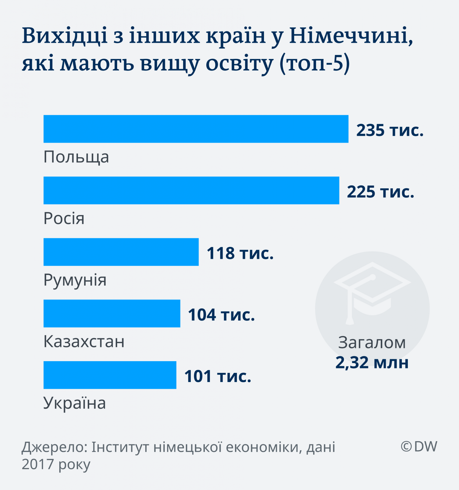 Первое же место по количеству выпускников университетов и других высших учебных заведений, которые сейчас живут в Германии, на 2017-й год заняла Польша - количество высококвалифицированных специалистов с высшим образованием из этой страны на рынке Германии составило 235 тысяч человек. На втором месте Россия - (225 тысяч), на третьем - Румыния (118 тысяч). На четвертом месте оказался Казахстан (105 тысяч).