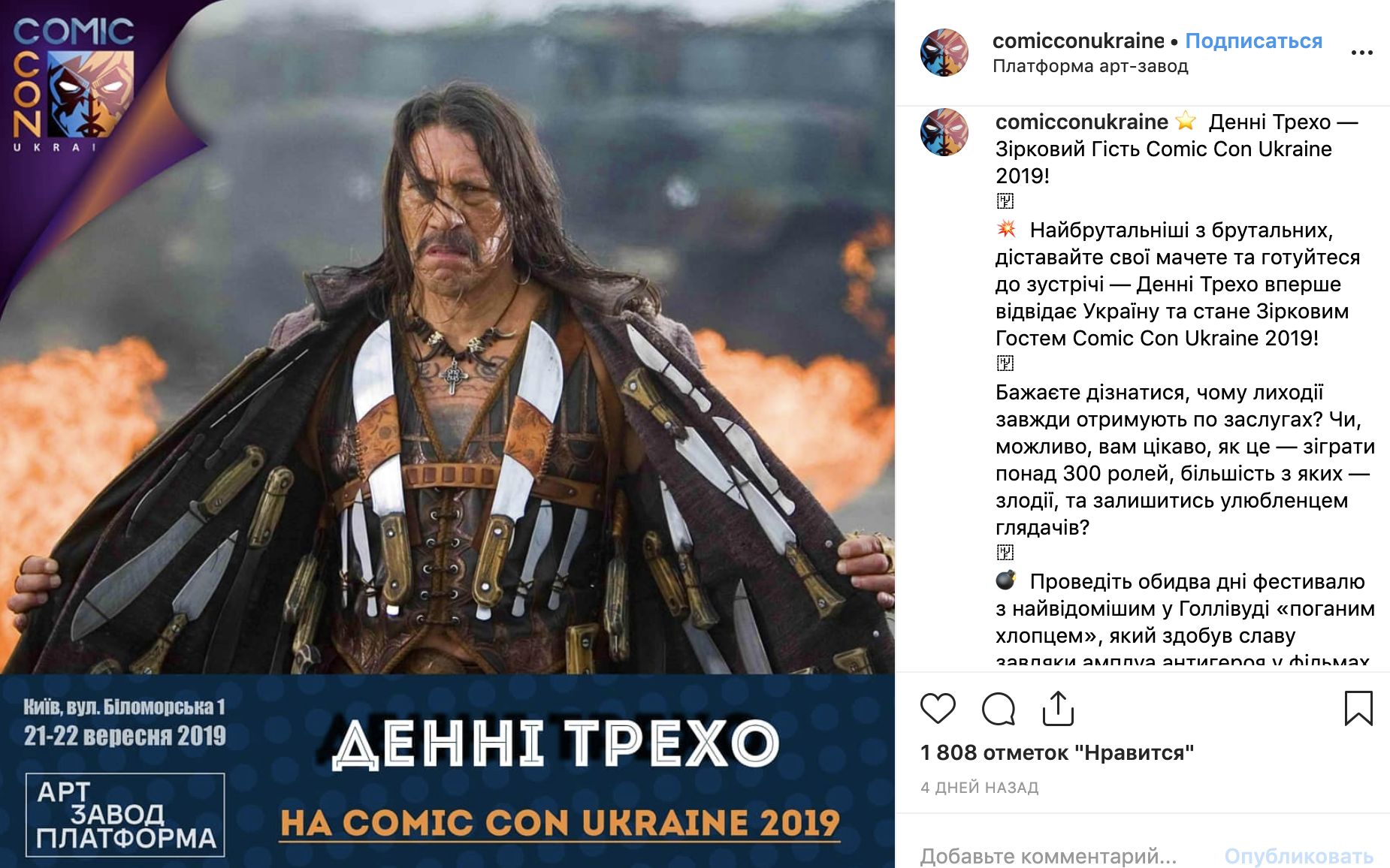 Американский актер Дэнни Трехо впервые посетит Украину. 21-22 сентября Трехо станет гостем фестиваля Comic Con Ukraine 2019. Об этом сообщает в Instagram пресс-служба фестиваля.