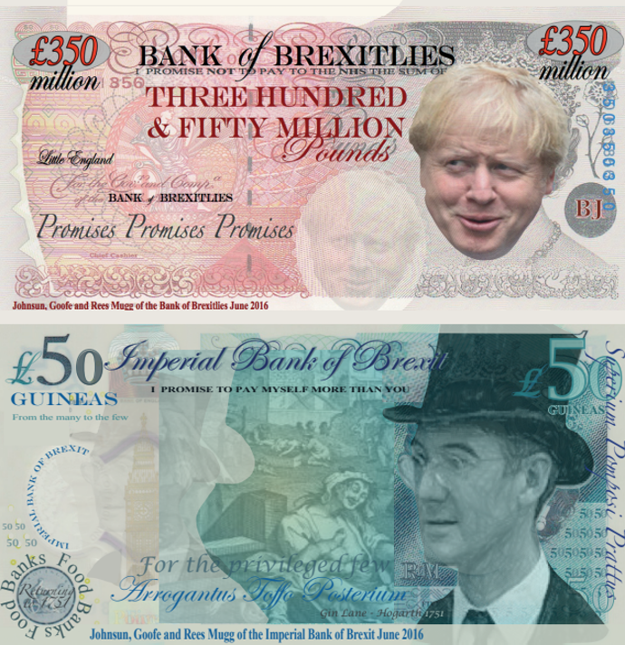Британский музей пополнил свою постоянную коллекцию двумя банкнотами с изображением Бориса Джонсона и Джейкоба Рис-Могга. Оба политика являются ярыми сторонниками выхода Великобритании из Европейского союза. Банкноты выпустила организация Bath for Europe, которая проводит кампании против выхода Великобритании из ЕС. Тысячи таких купюр раздавали на митингах против Брекзита. По словам основателя Bath for Europe Дика Дэниела, цель этих банкнот — обыграть невыполненные обещания политиков. Так, на купюре с изображением Рис-Могга написано «Я обещаю платить себе больше, чем вам».