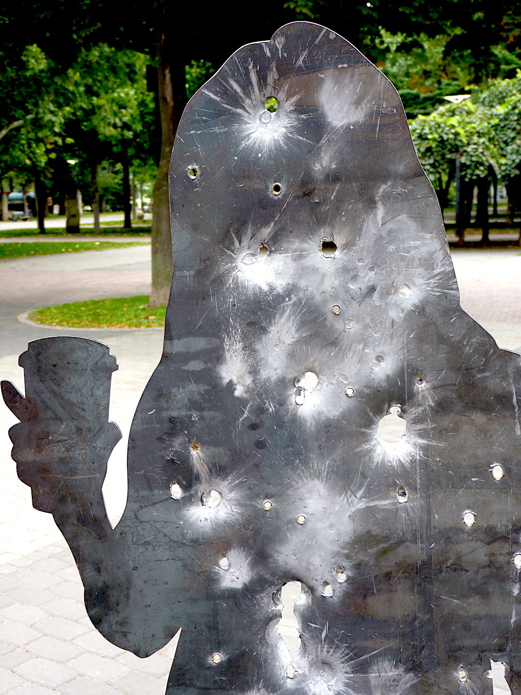 — Ці інсталяції — це простріляні силуети звичайних людей різних професій. Тобто на місці військових могли бути цивільні люди, які живуть своїм звичайним життям. Фігури завважки 20 кг кожна, виготовлені із товстого металу, вони добре закріплені. Нині вони сріблястого кольору, а з часом темнішатимуть і чорнішатимуть. І від цього ще більш виразно проявлятиметься той біль війни, який з роками не минає, а стає ще сильнішим, тобто буде чіткіша пам’ять про війну, — додав Олесь Кромпляс.
