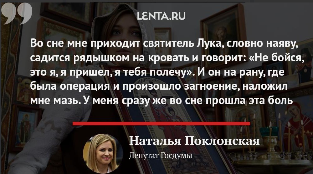 Депутат российской Госдумы Наталья Поклонская рассказала, как во сне к ней явился святитель Лука Крымский (Войно-Ясенецкий) и помог ей избавиться от болезни.