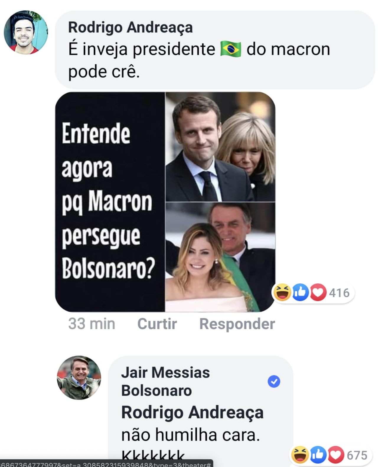 Один из сторонников Болсонару высмеял 66-летнюю Брижит Макрон, выставив в Facebook две фотографии: одну - жены Макрона, а вторую - жены Болсонару Мишель, снабдив комментарием: "Теперь вы понимаете, почему Макрон преследует Болсонару?"