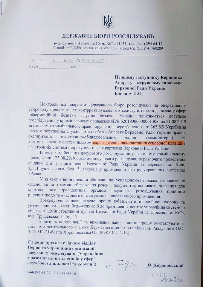Государственное бюро расследований опечатало центр управления системой голосования в Верховной раде. Об этом свидетельствует документ ГБР.