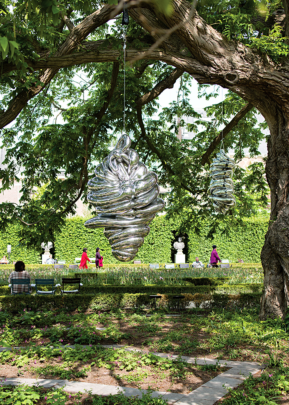 Так, знаменитая ее серия устрашающих своим видом пауков с огромными лапами, включенная в выставку, — «Паук» (1996), «Пара пауков» (2003) и «Крадущийся паук» (2003) — на самом деле образ матери как защитницы. А спирали из блестящего алюминия, подвешенные к большому ореховому дереву (серия Внутрь и наружу), отсылают к воспоминаниям об отце и его странной привычке подвешивать стулья на балках чердака. Э