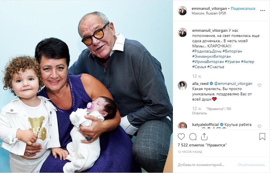 Актер Эммануил Виторган в возрасте 79-лет в очередной раз стал отцом. Об этом он сообщил на своей странице в Instagram.