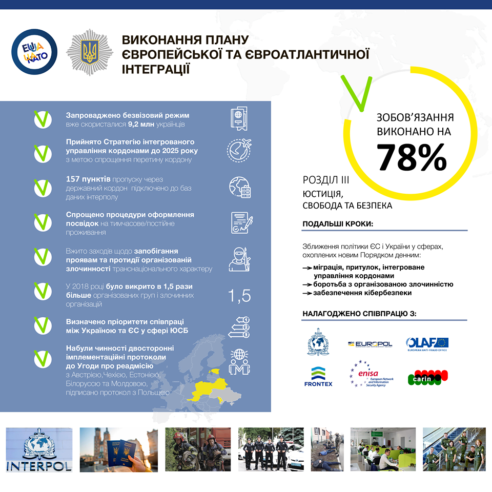 Министерство внутренних дел выполнило почти 80% обязательств по приближению к нормам и практики ЕС в сфере юстиции, свободы и безопасности вместе с Минюстом и МИД. Об этом говорится в отчете информационной системы по выполнению Соглашения об ассоциации "Пульс Соглашения" .