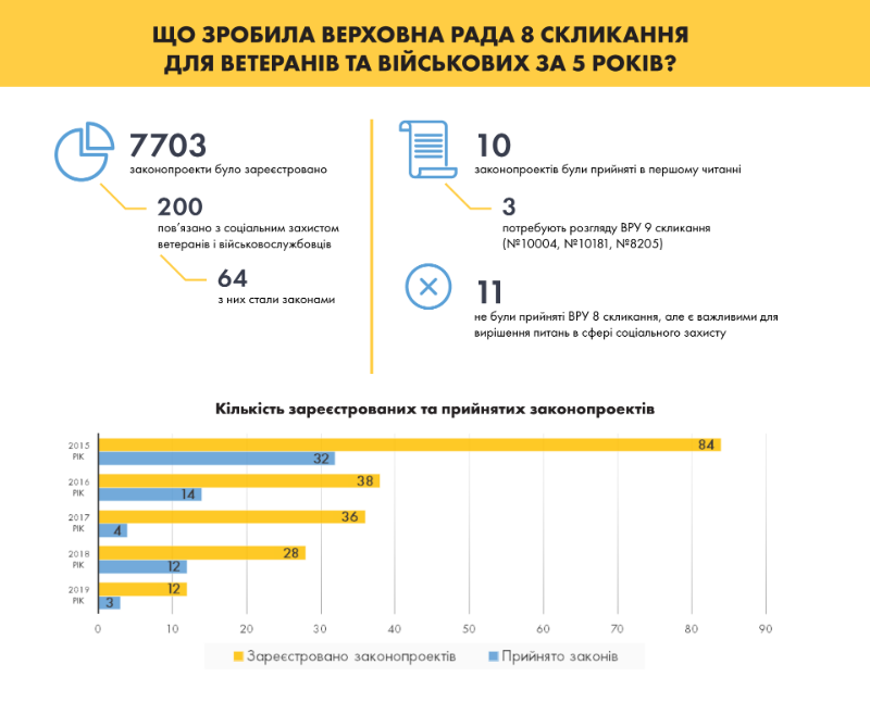 «У підсумку, із загальної кількості законопроектів, зареєстрованих народними депутатами Верховної Ради України попереднього, 8-го скликання, 3% (близько 200) було спрямовано на покращення соціального захисту військовослужбовців та ветеранів. З них 64 законопроекти стали законами» - зазначено у звіті ГО «Юридична Сотня». Більшість законів, про які йдеться, стосувалися надання та позбавлення ветеранського статусу, врегулювання питань, пов`язаних із проходженням військової служби та виконанням обов`язків військовослужбовцями в умовах існування особливого періоду.