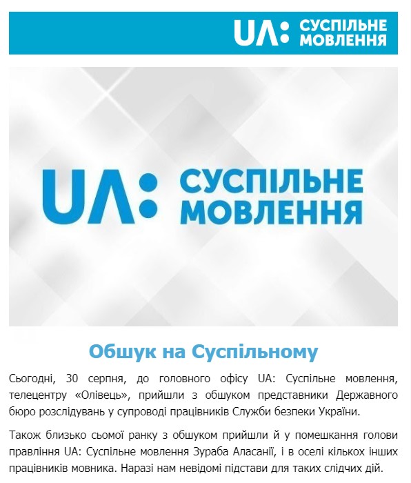 По информации Цензор.НЕТ, Государственное бюро расследований в сопровождении сотрудников Службы безопасности Украины проводит обыски в Национальной общественной телерадиокомпании Украины и в домах нескольких ее сотрудников.