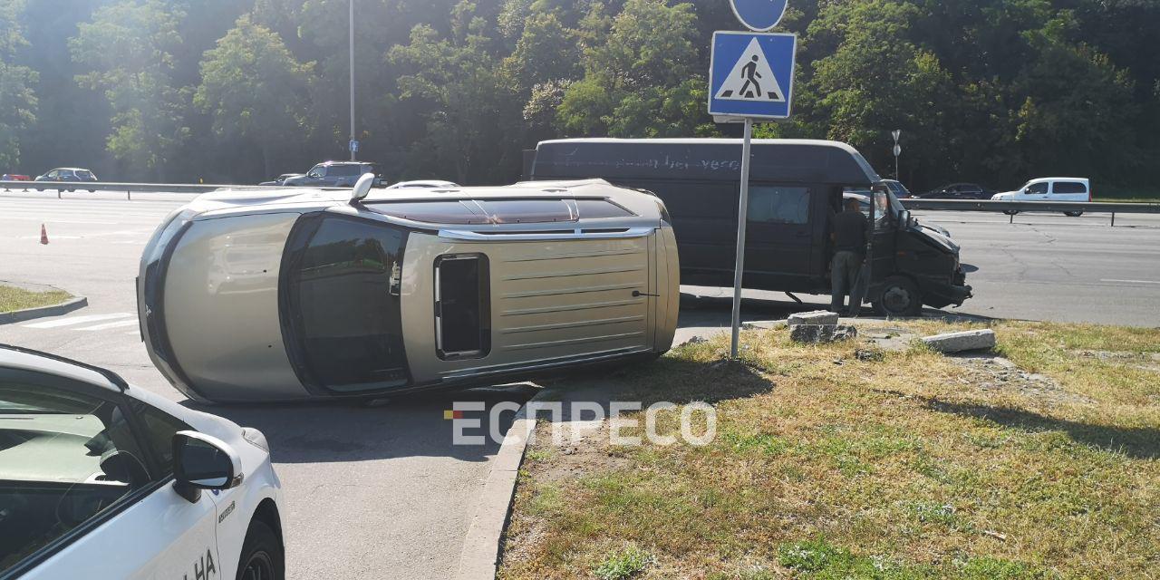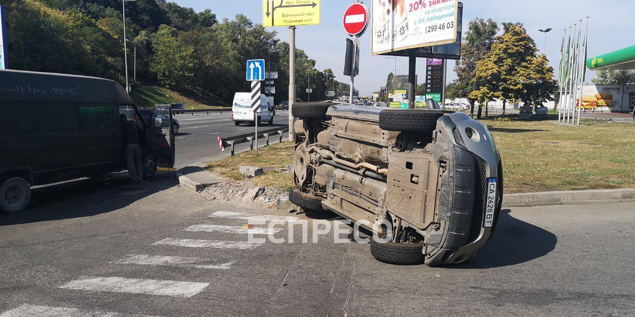 В Киеве, на Надднепрянском шоссе произошло ДТП с опрокидыванием.