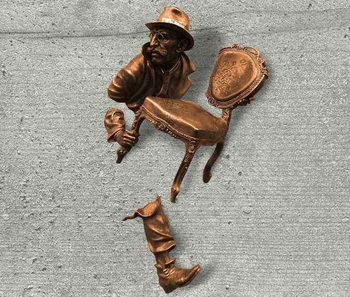 Бронзовый барельеф создал харьковский скульптор Катиб Мамедов. Арт-объект изображает Кису Воробьянинова, который как бы проходит сквозь стену, держа в руках стул.
