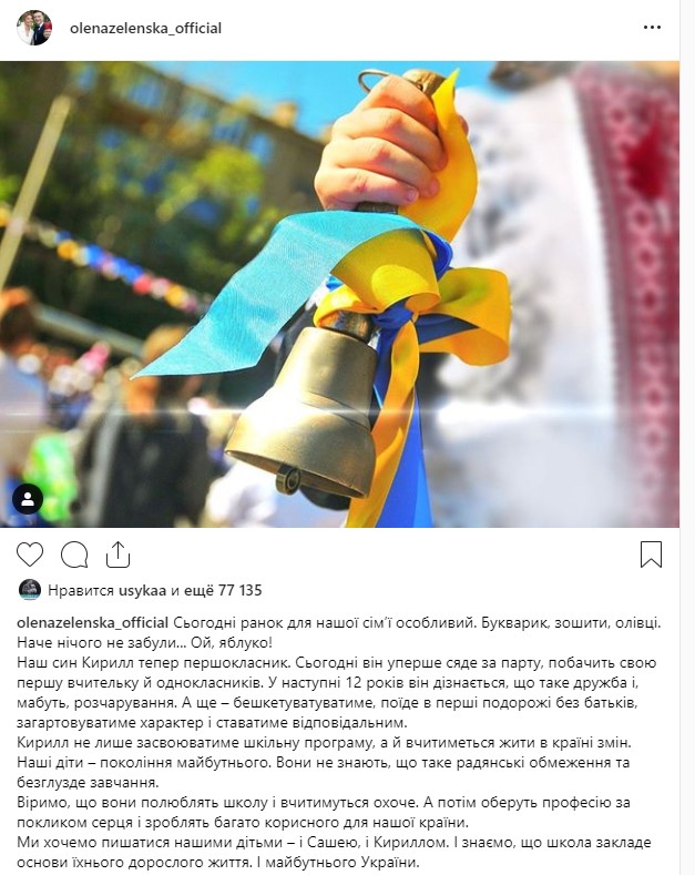 Супруга президента Украины Елена Зеленская в инстаграме рассказала, что их сын Кирилл пошел в первый класс.