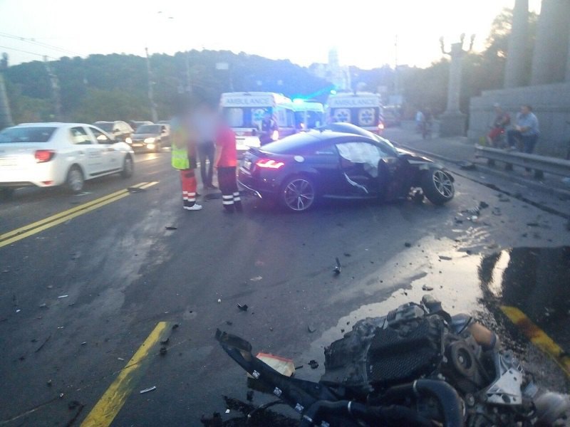 В Киеве, на мосту Патона, произошло масштабное ДТП с участием мотоцикла и двух автомобилей, в результате которого пострадали люди.