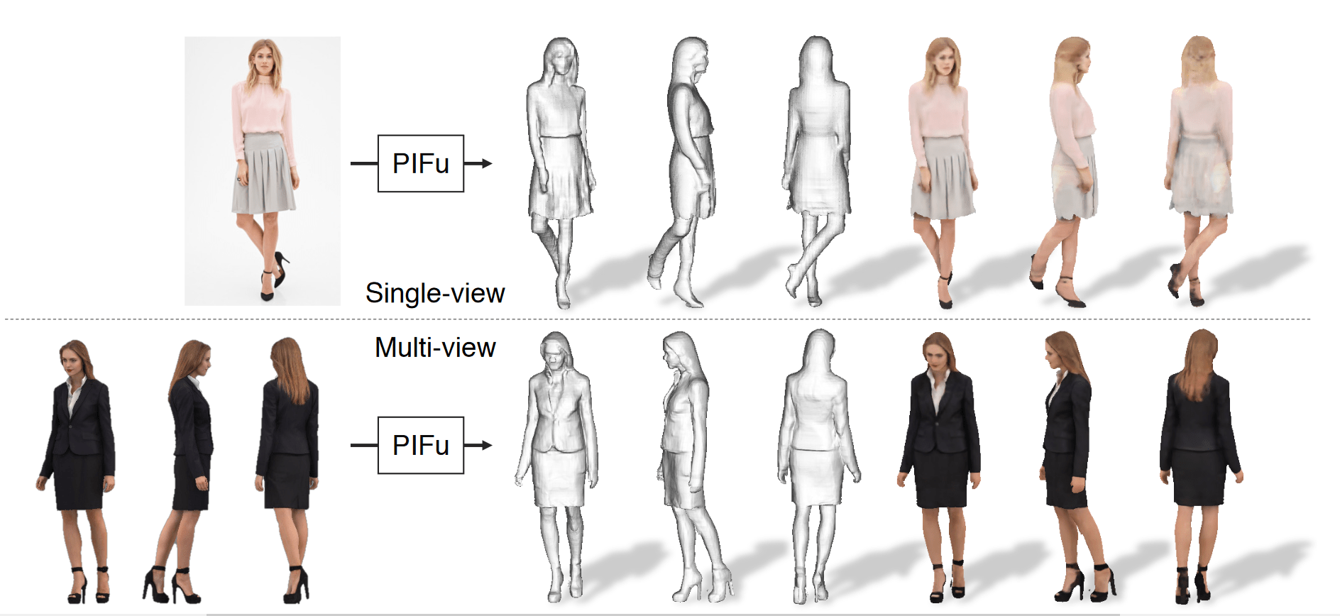 Как сообщается, решение, получившее название PIFu (Pixel-aligned Implicit Function), состоит из двух последовательных сверточных нейросетей, одна из которых анализирует исходный снимок (либо несколько исходных снимков), обнаруживает на нем тело человека и, используя методику под названием «Шагающие кубики», воссоздает по нему 3D-модель, а вторая придает получившейся модели цветность.