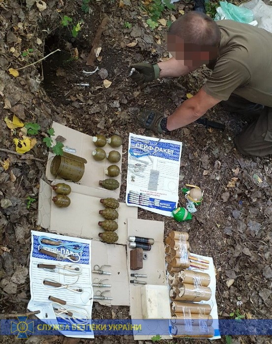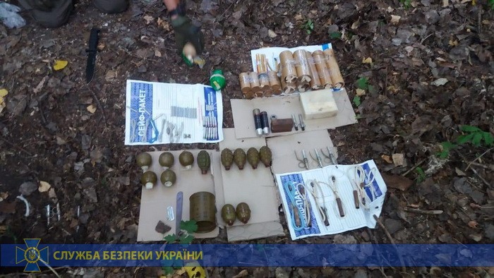 На Сумщині, у межах протидії підготовці та вчиненню злочинів терористичного та екстремістського характеру, під час проведення слідчих дій у лісосмузі виявлено схованку. З неї правоохоронці вилучили 14 гранат, два гранатометних постріли ВОГ, 25 запалів УЗРГМ, десять детонуючих шнурів із запалами, 16 детонуючих капсулів, дев’ять тротилових шашок та сім порохових зарядів до артилерійських боєприпасів.