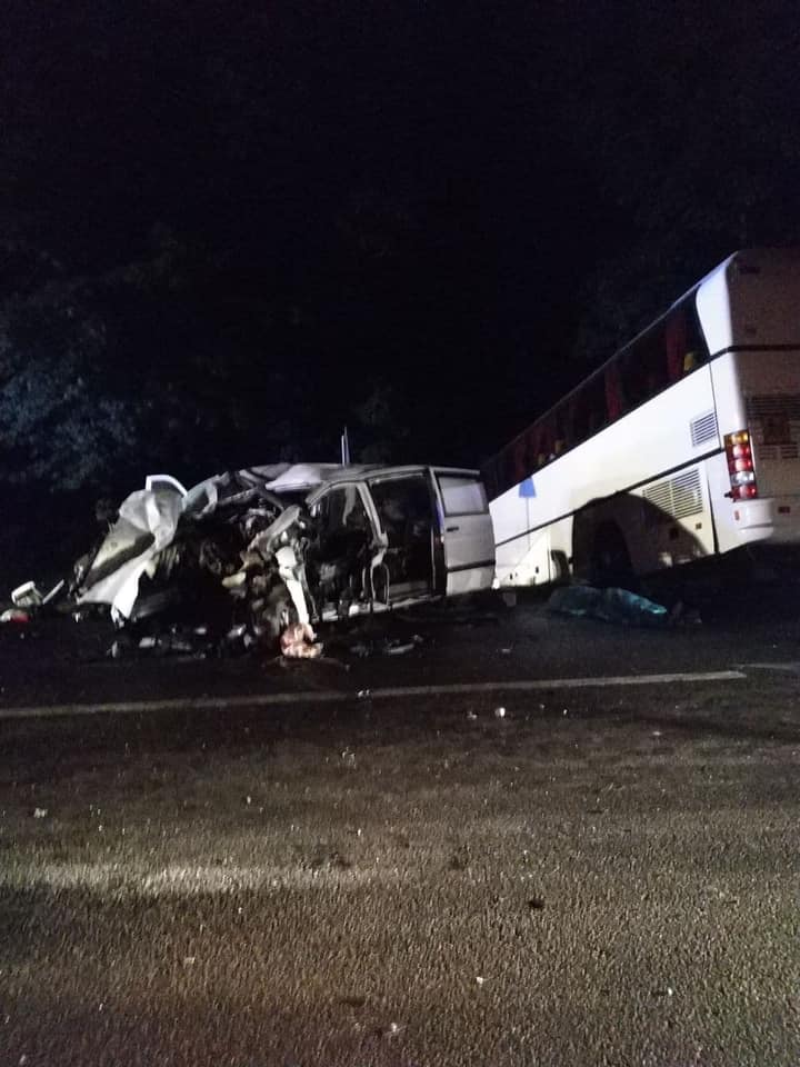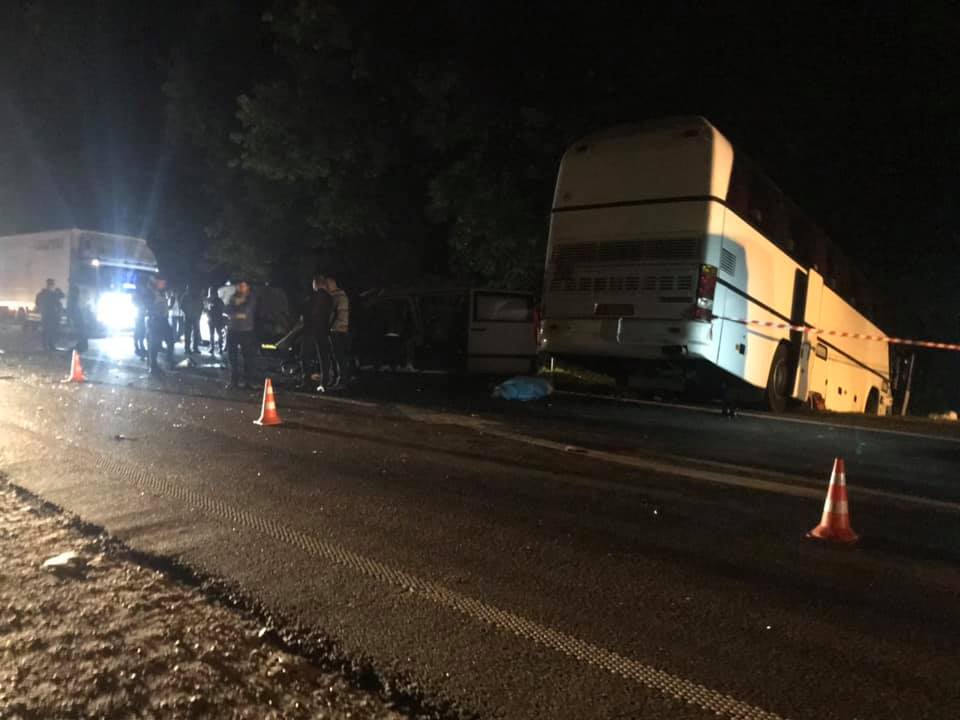 Авария произошла около девяти вечера на трассе Киев-Чоп возле села Банюнин. Столкнулись Mercedes Vito, Volkswagen Jetta и туристический автобус Neoplan.