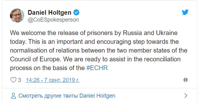 Совет Европы поприветствовал обмен политзаключенными между Украиной и Россией. Об этом в Twitter написал официальный представитель генерального секретаря Совета Европы Даниэль Хольтген, отмечает РБК-Украина.