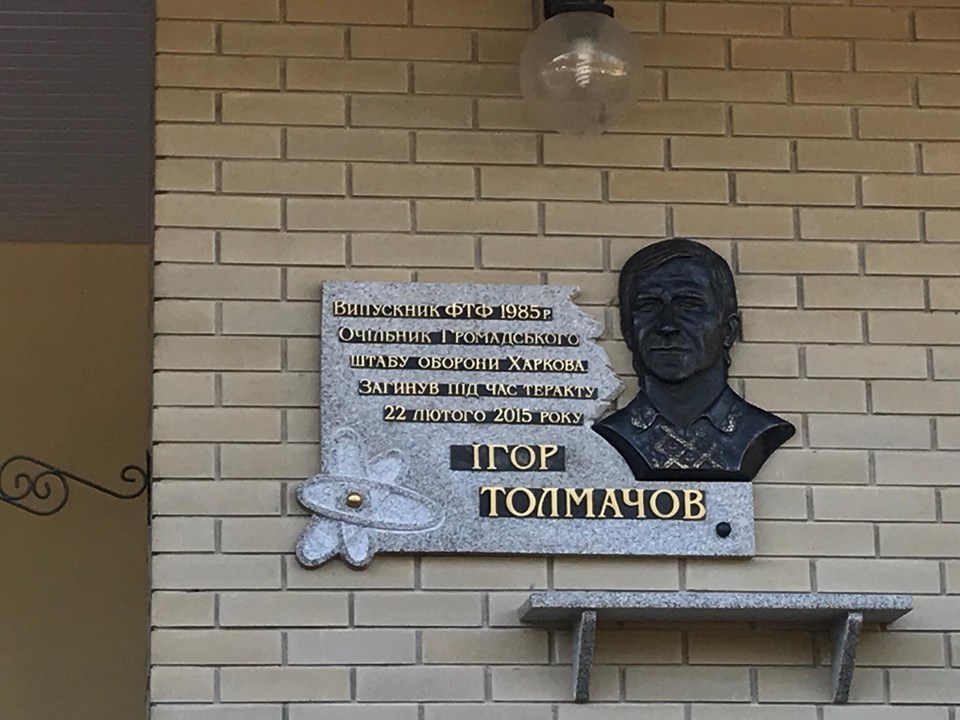Толмачев – выпускник Физико-технического факультета ХНУ им. В.Н. Каразина 1985 года. Работал научным сотрудником, вёл кружок туризма и жил в Пятихатках. Именно здесь теперь и располагается барельеф активисту.