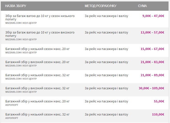 С апреля, малый регистрируемый багаж до 10 килограмм стоил от € 9 до € 36, а теперь цена будет от € 9 и до € 57. Увеличилась оплата и за регистрируемый багаж весом 20 и 32 килограмм. Диапазон цен на багаж весом до 20 килограмм теперь € 15 — € 83 (было € 15 — € 52), а на багаж до 32 килограмм — € 23 — € 109 (было € 23 — € 73).
