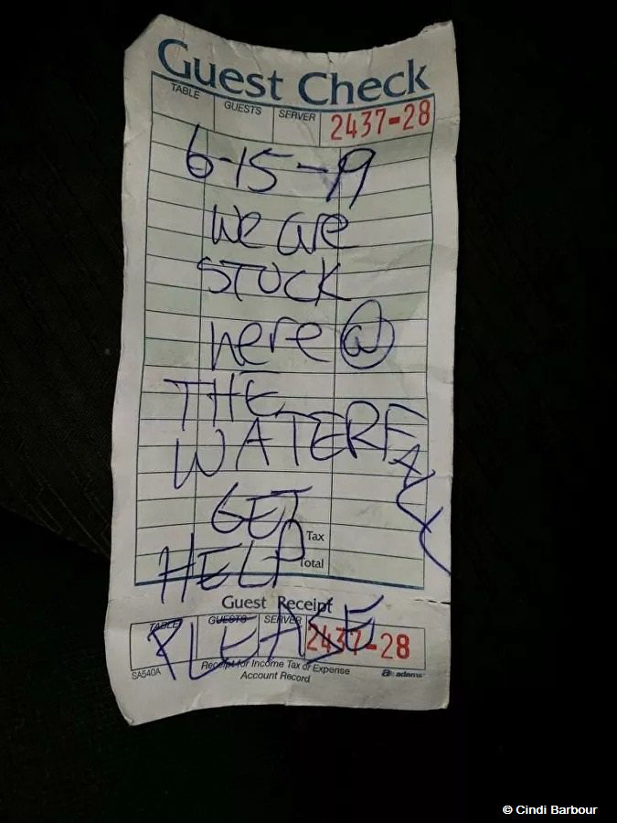 В результате они остались одни на обрыве без связи. Уотсон попытался позвать на помощь, но безуспешно. Тогда мужчина решил нацарапать на своей пластиковой бутылке слово "помогите" и спустить ее вниз по течению в надежде, что кто-нибудь обнаружит послание. Внутрь он положил записку, на которой обозначил свое местонахождение.