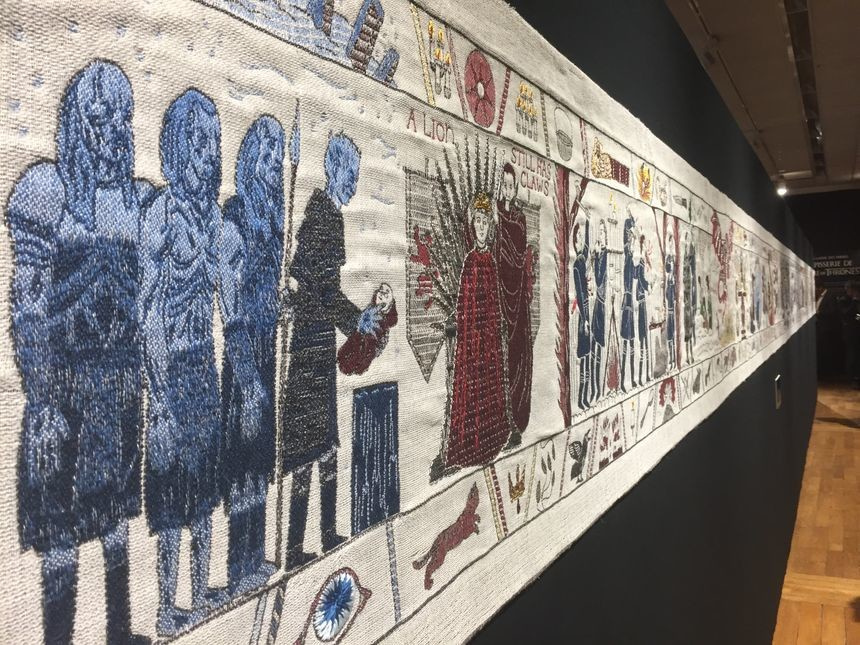 Экспозиция открыта до конца года, после чего гобелен отправят в Ирландию.На 90-метровом полотне в средневековом стиле изображены главные герои и сцены киносаги — семейство Старков, дракон, Король Ночи, дуэль принца Оберина и Горы, армия нежити, атакующая логово Трёхглазого Ворона и т.д.Отметим, гобелен по "Игре престолов" вывешен рядом со знаменитым памятником средневекового искусства — гобеленом из Байё, рассказывающим о нормандском завоевании Англии и событиях битвы при Гастингсе.