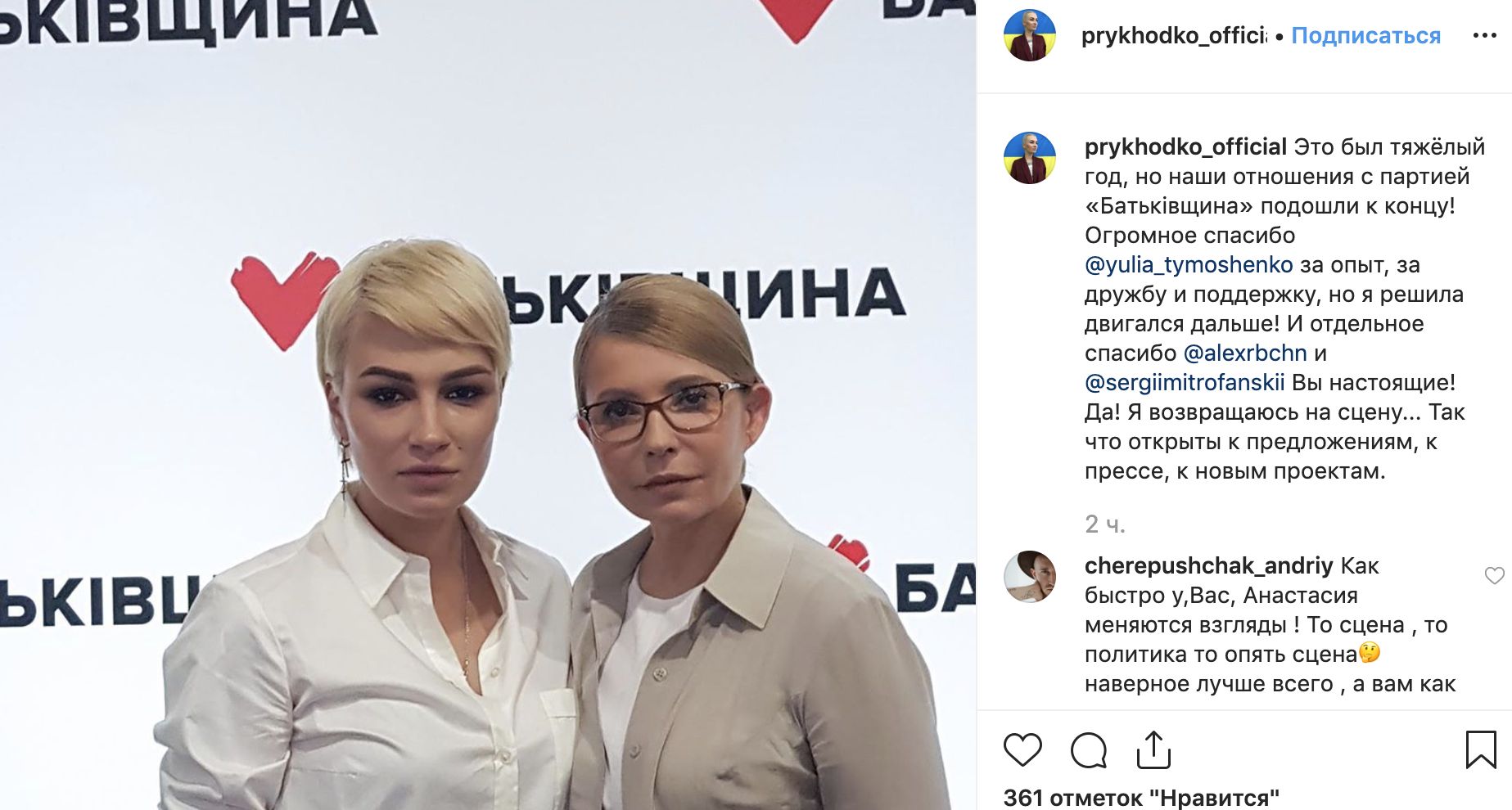 "Это был тяжелый год, но наши отношения с партией "Батькивщина" подошли к концу! Огромное спасибо Юлии Тимошенко за опыт, за дружбу и поддержку, но я решила двигаться дальше! Да! Я возвращаюсь на сцену", - заявила Приходько.