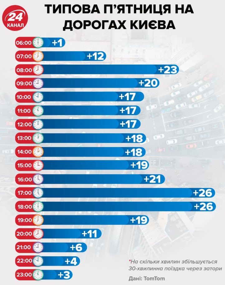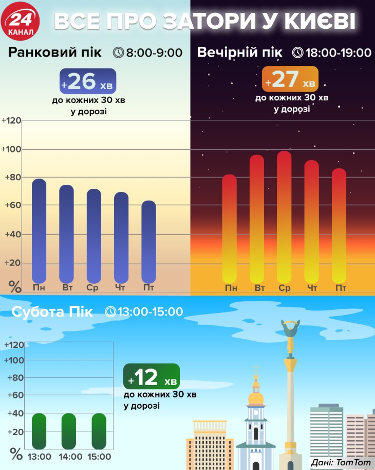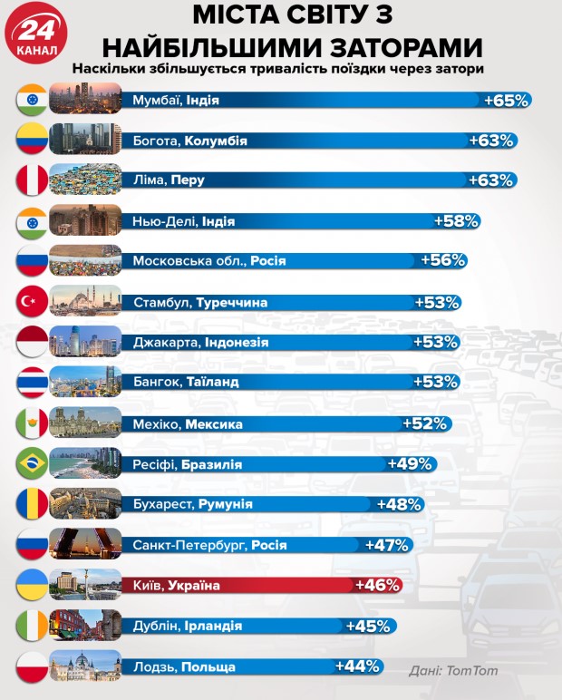 Лидером рейтинга стал город Мумбаи (Индия), здесь длительность поездки из-за пробок увеличивается на 65%. Второе и третье места заняли Богота (Колумбия) и Лима (Перу). Киев расположился на 13-й позиции, в украинской столице загруженность дорог такая, что средняя длительность поездки увеличивается на 46%. По сравнению с 2017 годом этот показатель увеличился на 2 процентных пункта. Утренний час пик в будни продолжается с 8:00 до 9:00, в вечернее время самые большие пробки образуются в 18:00-19:00.