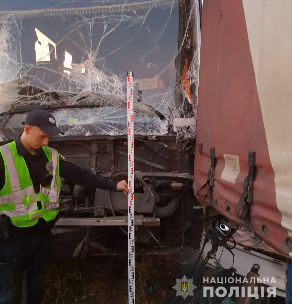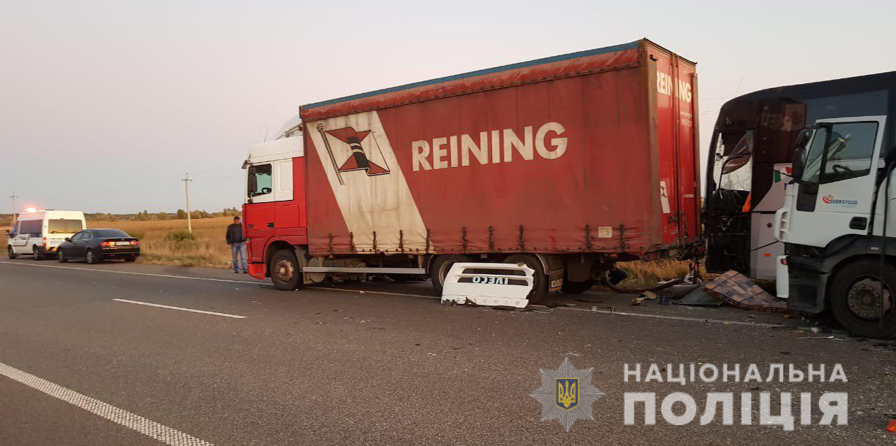 По информации полиции, двигаясь в направлении Харькова по скоростной трассе грузовик столкнулся с припаркованным на обочине пассажирским автобусом. От удара тот сбил троих мужчин, находящихся перед ним.