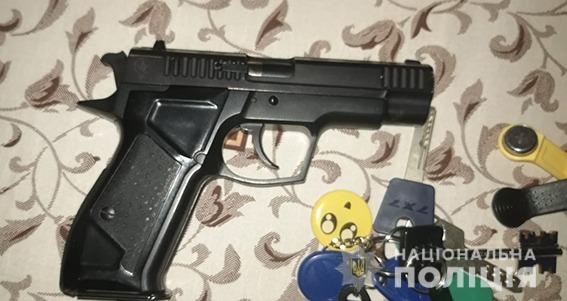 За місцем мешкання угонщина виявлено спецзасіб для відстрілу гумових куль, який значиться втраченим по обліках поліції, та 33 набої до нього, ключі до автомобілів та домофонів.