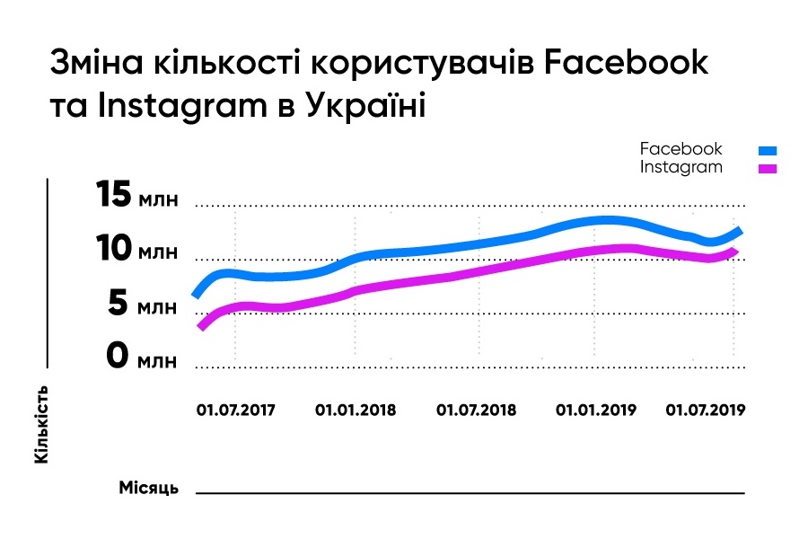 Тогда количество пользователей украинского Facebook сократилась с 13 млн до 12 млн, а Instagram — с 11 млн до 10 млн. Однако по состоянию на сентябрь 2019 года численность аудитории восстановилась. Более того, за последние 12 месяцев украинский Instagram рос более быстрыми темпами, чем Facebook, так что есть все основания полагать, что в краткосрочной перспективе Instagram станет социальной сетью №1 в Украине.
