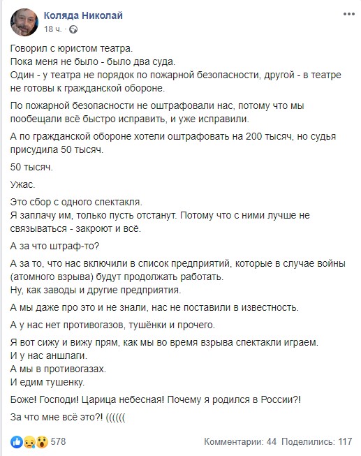 О наложенном штрафе сообщал на своей странице в Facebook создатель и руководитель театра Николай Коляда.